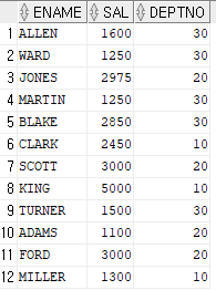- 2번(메인쿼리 메인쿼리): deptno가 10 IN(OR) 20인 사원들의 ename, sal, deptno 조회