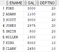- 1번(서브쿼리 결과): 급여가 3000이 넘는 사원들의 부서번호(중복 제외) → 10, 20