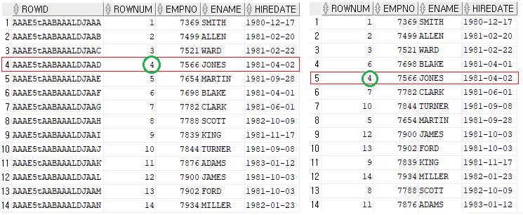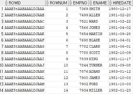 SELECT ROWID, ROWNUM, empno, ename, hiredate