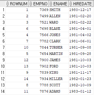 SELECT ROWNUM, empno, ename, hiredate