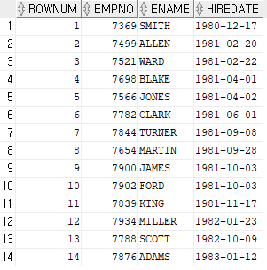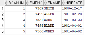 SELECT ROWID, ROWNUM, empno, ename, hiredate