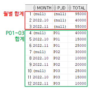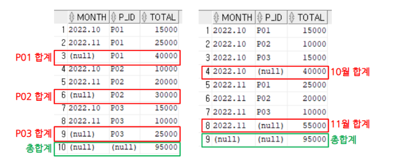 GROUP BY로 묶은 각각의 그룹 합계와 전체 합계를 모두 구할 수 있음 → 순서가 바뀌면 결과도 바뀜