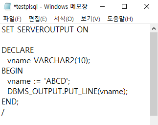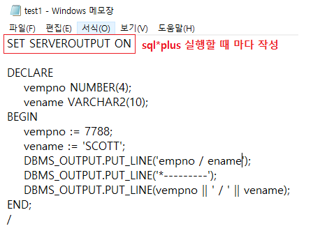 - sql*plus에서는 PL/SQL 블록이 끝났음을 명시하기 위해 반드시 '/' 작성해야 함.
