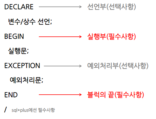 - (형식) DECLARE ~ BEGIN ~ EXCEPTION ~ END;