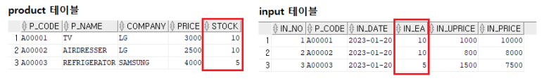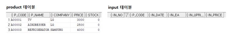 ② 상품이 입고되어 input테이블에 상품이 입력되면 product테이블의 stock에 추가하는 트리거 작성