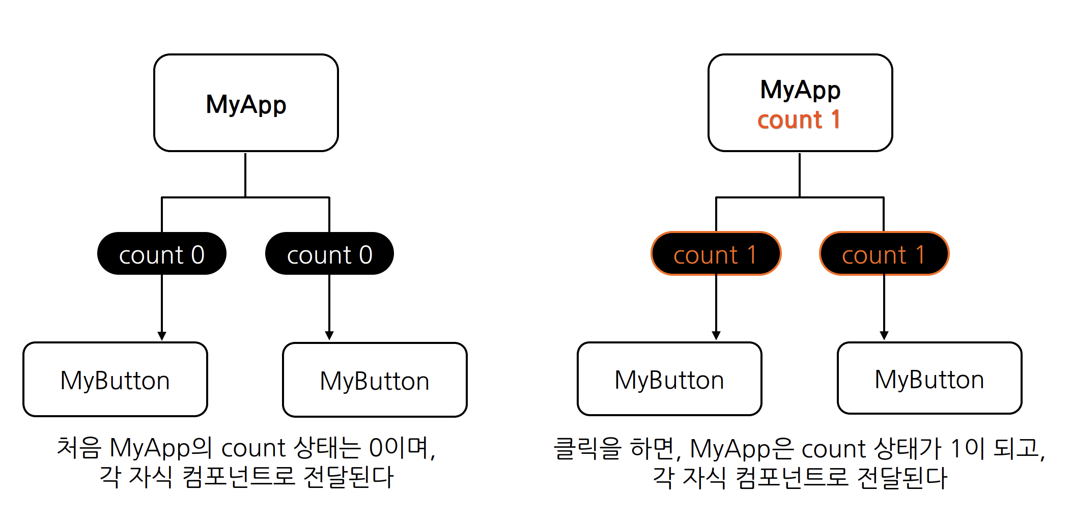 위 예제들은, 각 MyButton은 독립적으로 count를 가지고 있었으며, 각 버튼이 클릭되었을 때 클릭된 버튼의 count만 변경이 되었다.