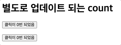 만약, 같은 컴포넌트를 여러번 렌더링한다면, 각각의 컴포넌트는 고유의 상태를 가지게 된다. 각 버튼을 따로 클릭해보자.