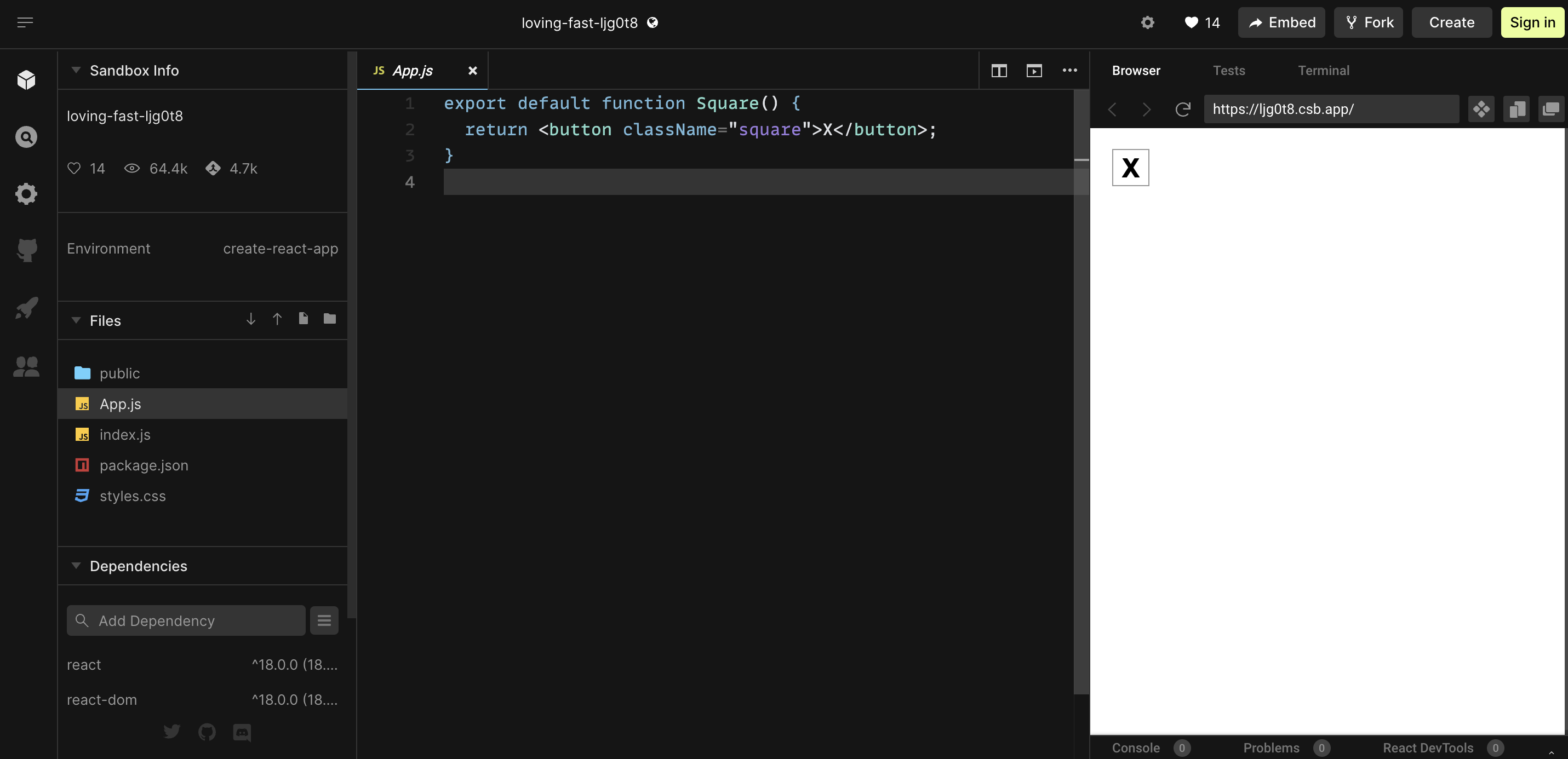 이제 Square 컴포넌트를 클릭하면 X로 채워지도록 만들어보자. Square 내부에 handleClick이라는 함수를 선언한 다음, Square에서 반환되는 button JSX 요소의 props에 onClick을 추가한다.