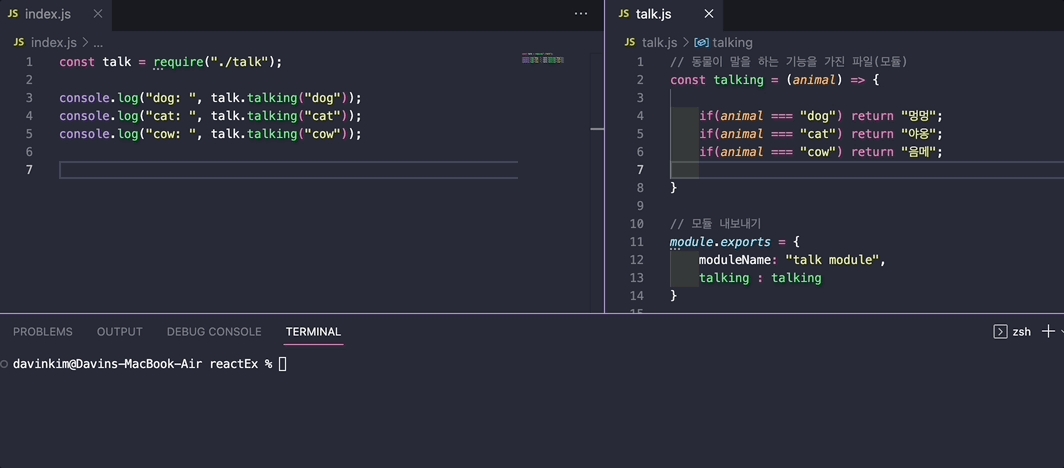 node.js를 사용하여 다른 파일에 있는 함수를 사용할 수도 있는데, 만약 talk.js가 '동물이 말을 하는 기능을 가진 파일'인 모듈이라 한다면 이 모듈을 내보낼 수 있다.(단, 이때 사용되는 함수들은 node.js가 설치되어있어야만 정상적으로 작동한다.)