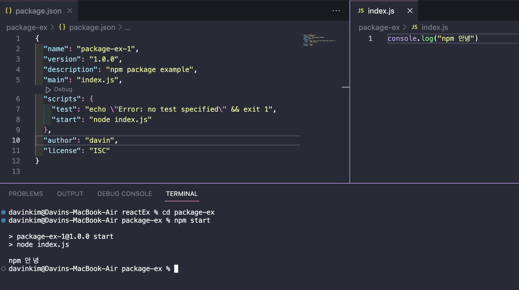 만약 이 곳에 "start": "ndoe index.js" 라고 작성한 후 터미널에 'npm start' 라고 작성하면 index.js 파일이 실행된다.