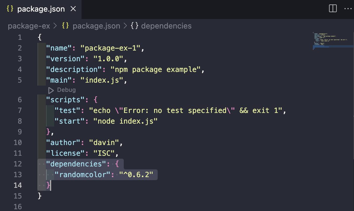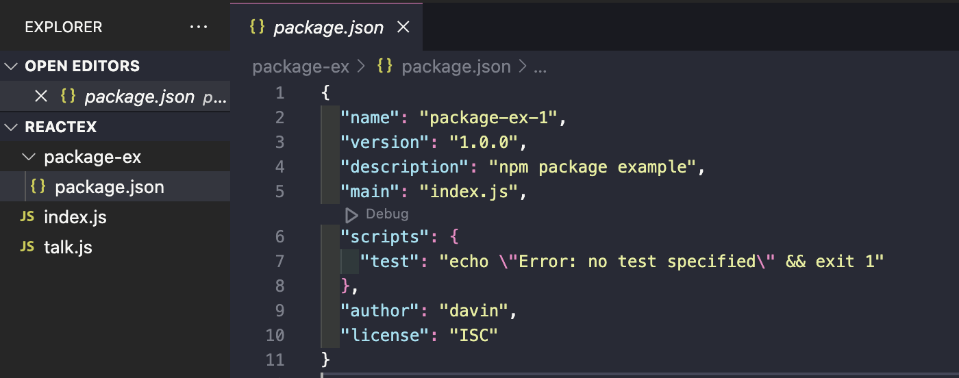 만약 이 곳에 "start": "ndoe index.js" 라고 작성한 후 터미널에 'npm start' 라고 작성하면 index.js 파일이 실행된다.