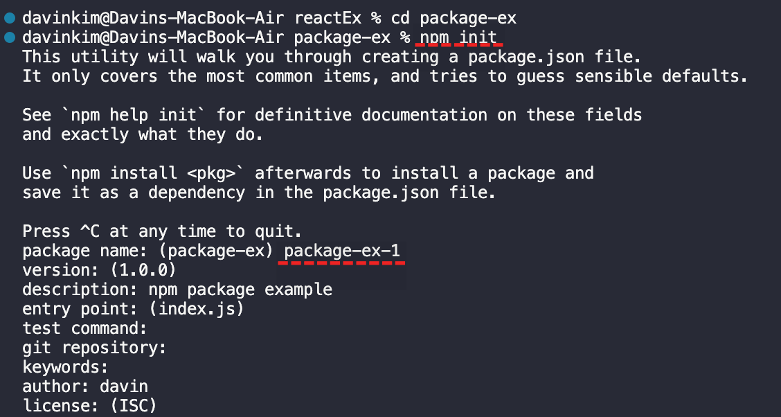 그 후 해당 package에 대한 정보를 입력한 후 엔터를 한다.(package name은 소문자로만 작성하여야 한다.)