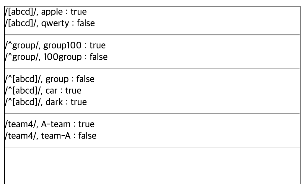 div1.innerHTML += "/^[abcd]/, group : " + regEx3.test("group") + "<br>"