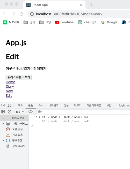 <button onClick={()=>setSearchParams({who: "Hong"})}> 쿼리스트링 바꾸기 </button>