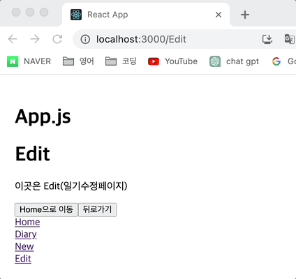 <Route path="/Edit" element={<Edit />} /> {/* path가 /Edit라면 Edit 컴포넌트를 렌더하라는 명령*/}