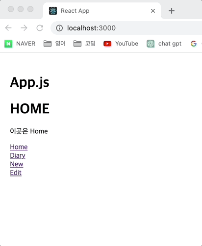 만약, 해당 프로젝트에서 Home,New, Edit, Diary 총 4개의 페이지가 사용된다면, 먼저 src 폴더 내에 해당 컴포넌트들을 만들어 준 후 App.js에서 import하여 매핑해줄 수 있다.
